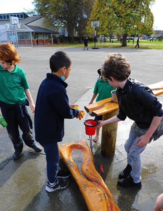 School principal Donna Buchanan says, "Our students and community love the playground. The sounds of children playing in spaces that reflect their interests, needs, ages and stages warms our heart. We have less playground problems because students have their needs met in so many different ways, in spacious and defined areas. The water race and sandpit are incredibly popular."
