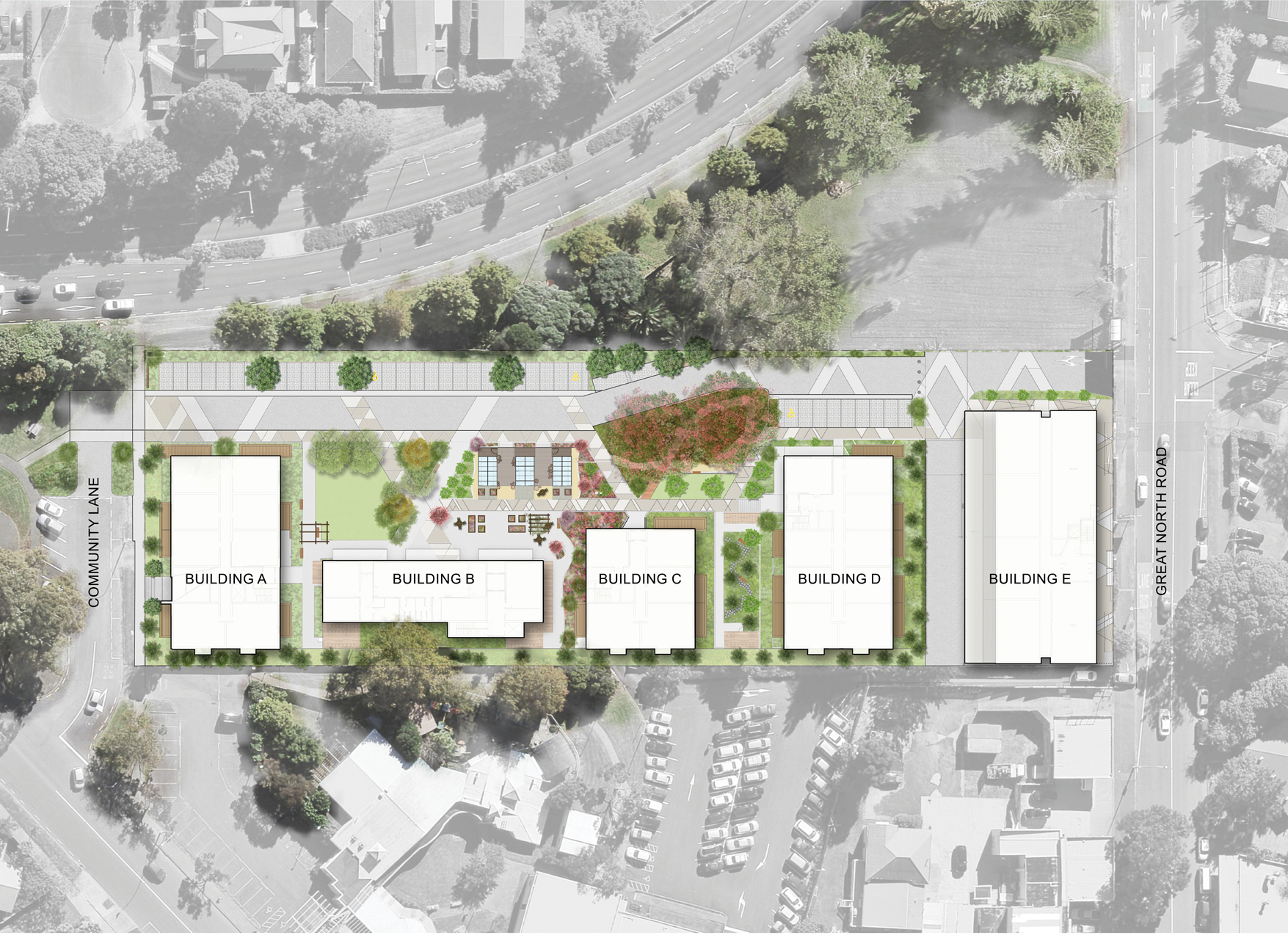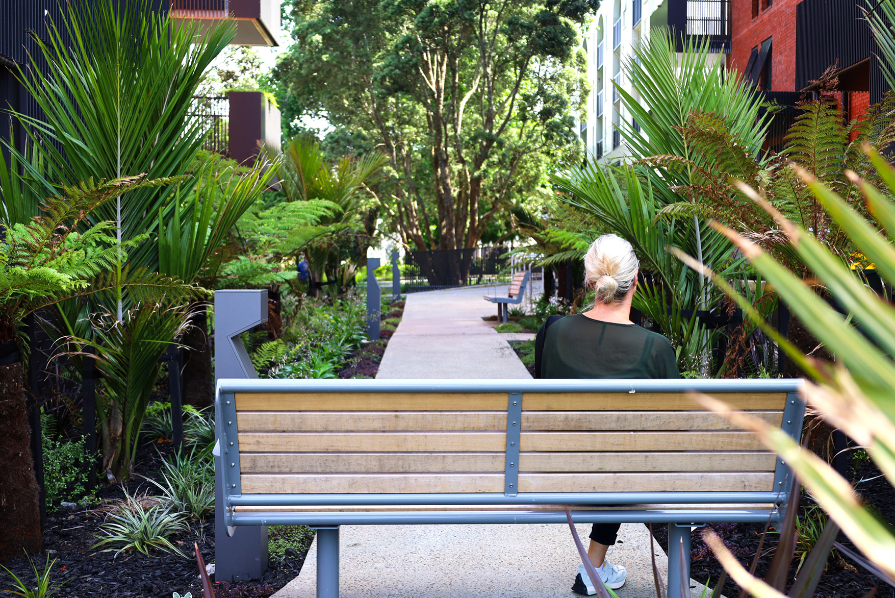 The landscape spaces are integral to the success of this development and for the on-going health and wellbeing of the future residents. The desire to minimise carparking allowed the northern laneway to be prioritised for pedestrians and market day uses. Staggered landscape courtyards undulate between the buildings on the northern frontage, creating a community heart which benefits from the retention of two large Pohutukawa trees and a borrowed landscape outlook to the established trees along the northern boundary to Ash Street.