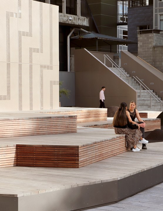 Created with a human scale and tactile quality, the plaza space provides opportunities for people to meet and engage with each other and the building itself. By expressing the presence of the Indigenous Māori community. Heke Rua is a reminder of the people who once lived on this site, Pipitea.