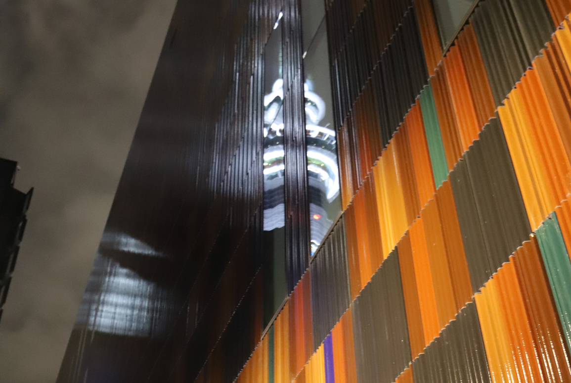 Sarah Hughes’ glass artwork features vertical fin panels on the east and west walls of the NZICC and flat glass panels on the north and south sides. The imagery uses 60 different colour tones and is inspired by her upbringing in rural Northland near the Waipoua forest, New Zealand’s largest kauri forest.
