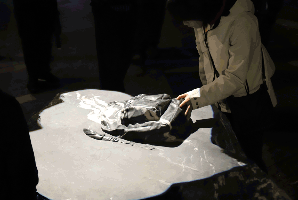 The satin finish of the stone draws the hand and eye, while the objects – sneakers, a baseball cap, puffer jacket, sunglasses, gloves and a backpack – are illuminated by custom-designed lights.