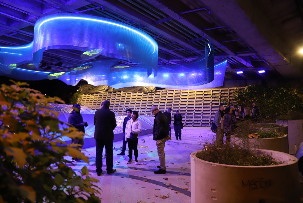 Urban art is an integral aspect of the improved underpass, which now features a continuous pūhoro pattern moulded into concrete ramps and Waimahara overhead, evoking the Te Waihorotiu awa, which ran through the valley (Myers Park), into the wetland and down the valley (now Queen Street) to the Waitemata at Horotiu Bay.