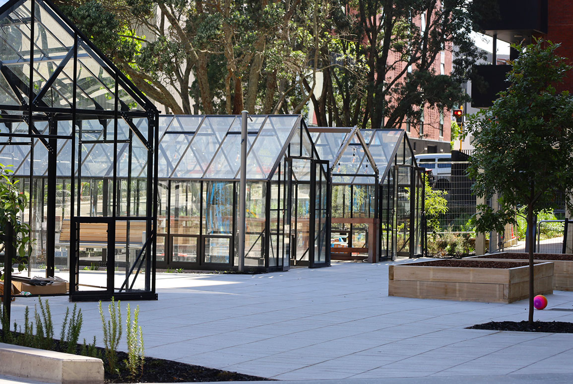 Community Lane (Highbury Triangle seeks to provide warmer, healthier, and more energy-efficient homes for tenants, and sustainable initiatives and solutions were sought through all phases of the project. Early on, materials sourced from the demolition of the existing state homes were salvaged and re-purposed to create a pop-up market at another nearby Kāinga Ora project. The Boffa Miskell team provided designs and plans for constructing planter boxes and pergola structures.