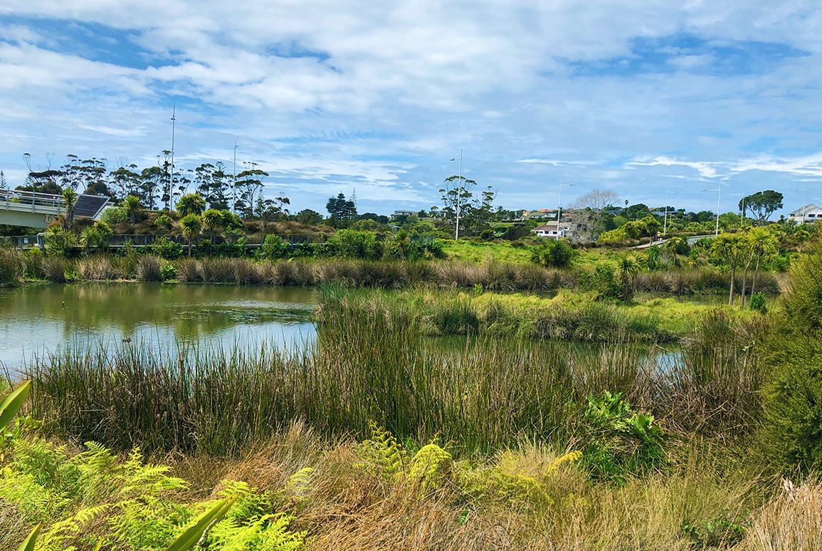 Awaruku stream and wetland was one of five sites on the New Zealand Institute of Landscape Architects Tuia Pito Ora (NZILA) recent Sponge Project tour. The Auckland branch event involved a group of landscape architects and students viewing five exemplary ‘Sponge City’ project sites, with a short talk-and-walk at each one. Alfred Chan represented Boffa Miskell at the Long Bay/Awaruku stop, on the North Shore.
