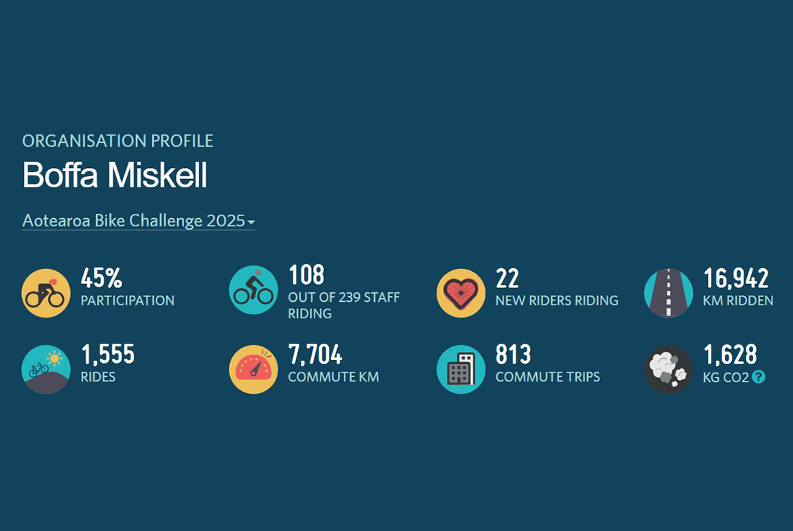 Even better, according to the final statistics, the cumulative effect of the 108 Boffa Miskell consultants making their weekday commute via pedal power equates to 1628kg of carbon dioxide that didn't go into our atmosphere.