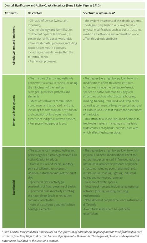 Furthermore, the three categories (or attributes) can be listed or described as follows (these examples were used for the Marlborough Coastal Study and subsequent other coastal studies undertaken by Boffa Miskell). Zone A was the marine area and Zone B the terrestrial area.
