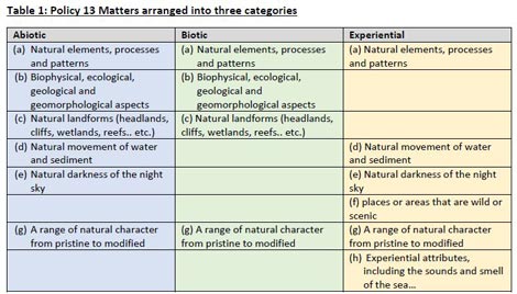 NZCPS Policy 13 lists a number of matters (which are contained in full within Appendix 1 of this Think Piece). Acknowledgement needs to be made on the word ‘may’ within the policy. This list implies that depending on context, not all ‘may’ be relevant and that not all have been listed. The list within the policy is a mix of factual (or natural science based) and perceptual, although there is a cross-over in many places. There are also words on the list that will sometimes overlap (i.e. geological and geomorphological processes under (b) and then described in (c) as landforms etc.).