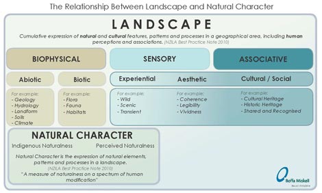 A diagram, produced by Boffa Miskell assists to articulate this, and is contained overleaf. Whilst the diagram is not final or fixed, it attempts to illustrate how natural character is a part of, or component of landscape. Through analysis of its usage and its definition, it is considered that natural character sits at the natural science-end of landscape and includes a small part of the human sensory aspects of landscape (i.e. experiential). This is not to say that landscape assessments exclude these attributes, it is simply identifying that natural character is associated with the more natural science part of landscape (when assessing the coastal environment, wetlands and lakes and rivers and their margins) and that the methodologies for undertaking these studies, are different. The diagram refers to all landscape assessment purposes, not simply identification of outstanding natural landscapes.