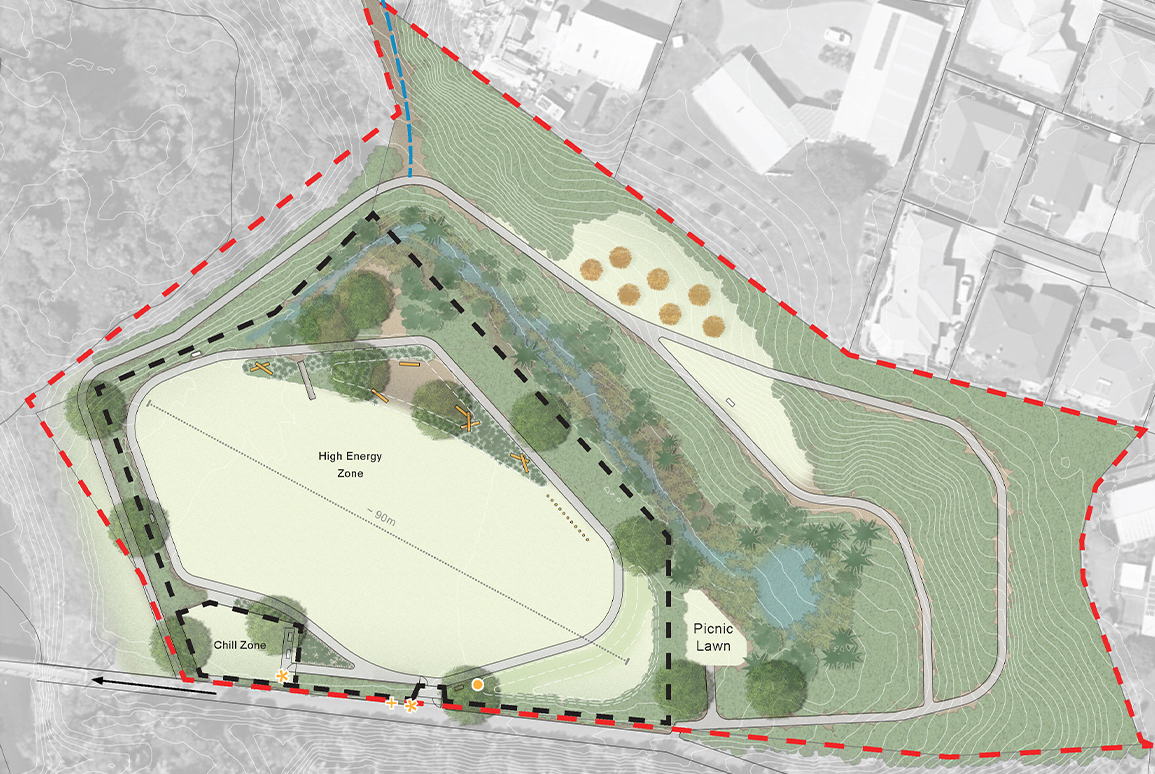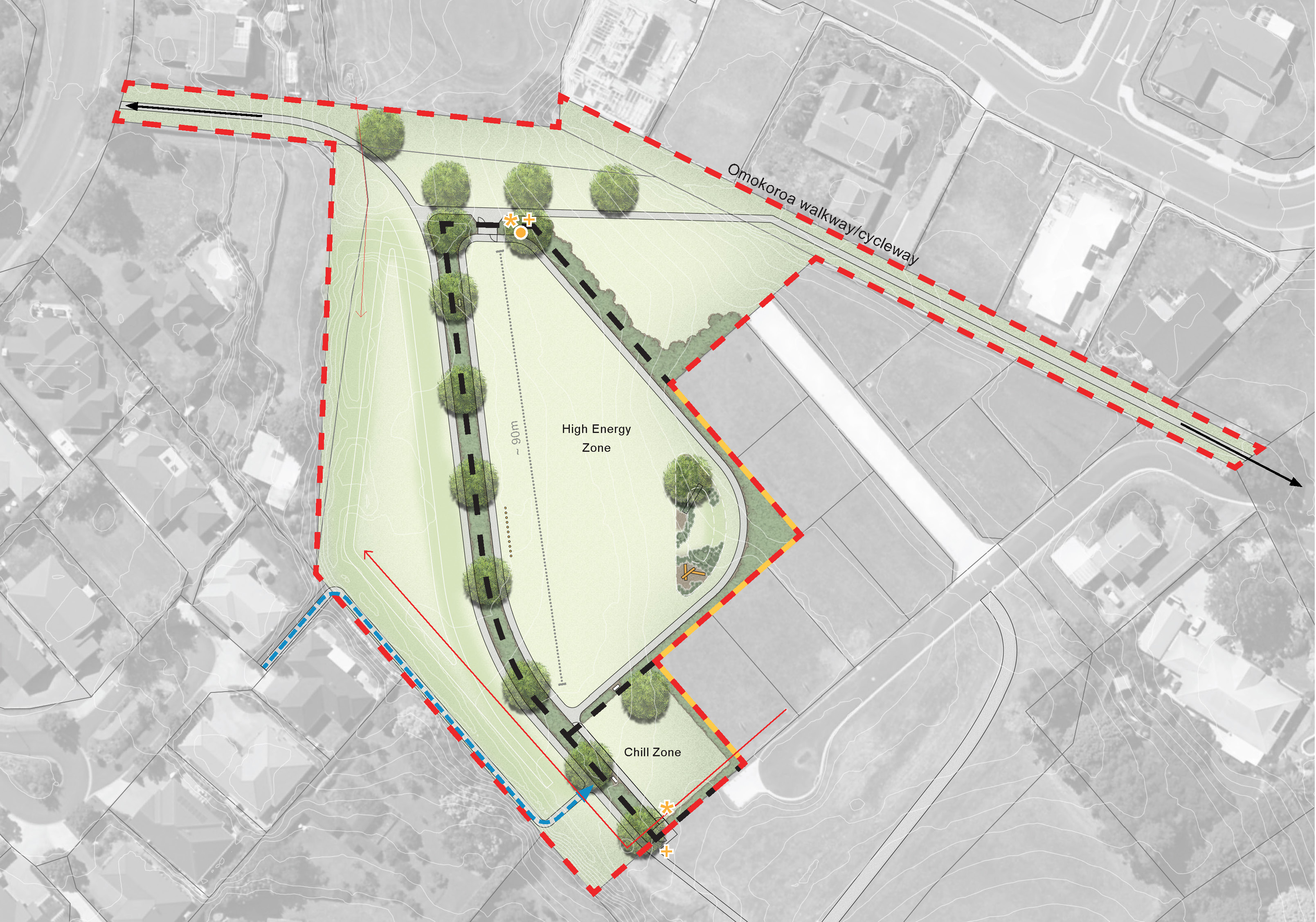 The Links View Reserve in Omokoroa (above) is an oddly-shaped bit of public greenspace in the middle of a residential area, and next to an existing stormwater retention area. Tessa's plan centres on a wide-open space, with smaller places for exploring and sniffing around. A path encircles the park, so owners can walk or run while the dogs play.