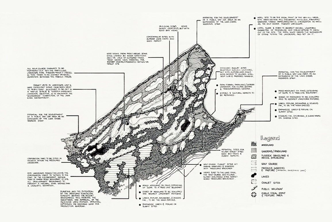 As the 154ha site was specifically zoned for a Tourist Resort, the application documentation was to provide sufficient information to enable the Hearing Committee to make a decision on the Masterplan. The graphics were prepared by Steve Drakeford, a landscape architect from Boffa Miskell’s Wellington office who has now retired.