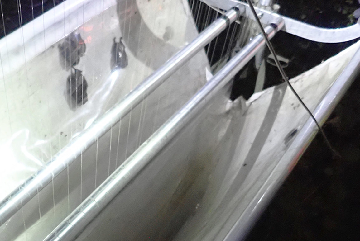 As long-tailed bats usually change roosts nightly, high frequency transmitters are used to locate new trees each morning. Bats are initially caught in free standing harp traps (a specialist bat trap made of parallel strands of fishing line which is undetectable by echolocation) to attach a transmitter to a lactating female. The following morning, she is radio-tracked to a tree and a potential roost hole is identified. Traps are set up covering the roost entrance and the waiting game begins.
