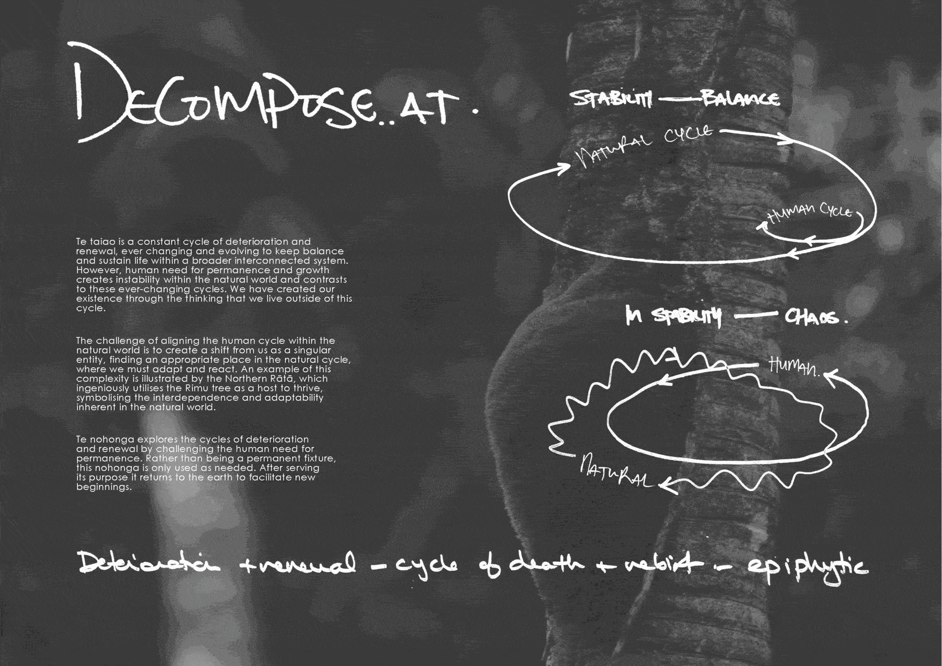 Each segment of the seat embodies a distinct phase of the cycle, guiding users through a narrative journey. From the towering presence of Te Wao Nui represented by the felled tree trunk, to the utilisation of timber slats symbolising Te Rauemi, the seat design intricately reflects the essence of each stage. The shape of the seat itself evokes the form of Te Waka, symbolising exploration and new horizons. The raised back and sheltered sides embody the concept of Te Whare, offering users a sense of sanctuary and warmth. Ultimately, the entire nohonga is grounded, serving as a tangible connection to Papatūānuku, completing the cycle. Its alternating orientation provides individuals with the opportunity to align themselves with either Ka Mua or Ka Muri, inviting introspection and engagement with the timeless rhythm of nature’s cycles.