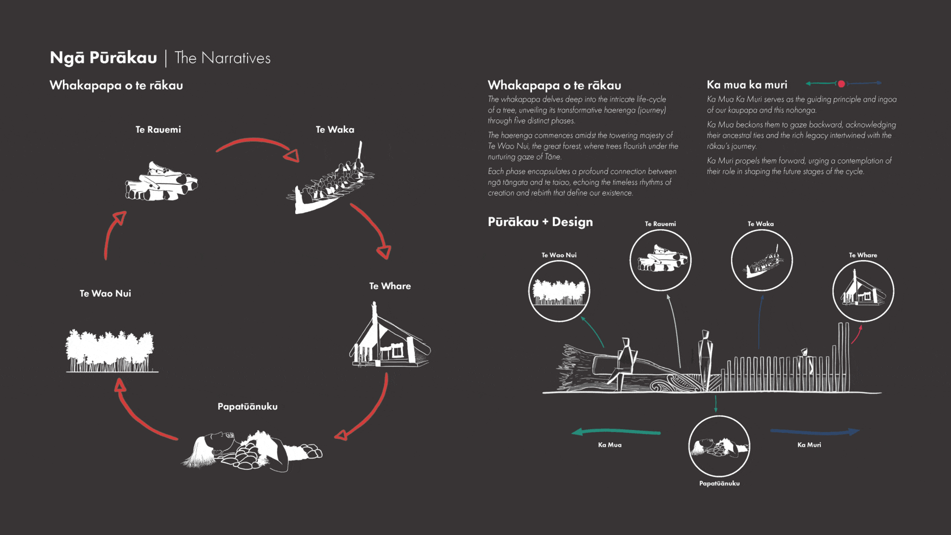 The team of Zak Kelland, Nicole Tune and Hamish Murphy used Ka mua, ka muri — a whakatauki that means "walking backwards into the future" — as the title and inspiration for their nohonga, which expresses the intricate life-cycle of a tree, unveiling its transformative journey through five distinct phases.