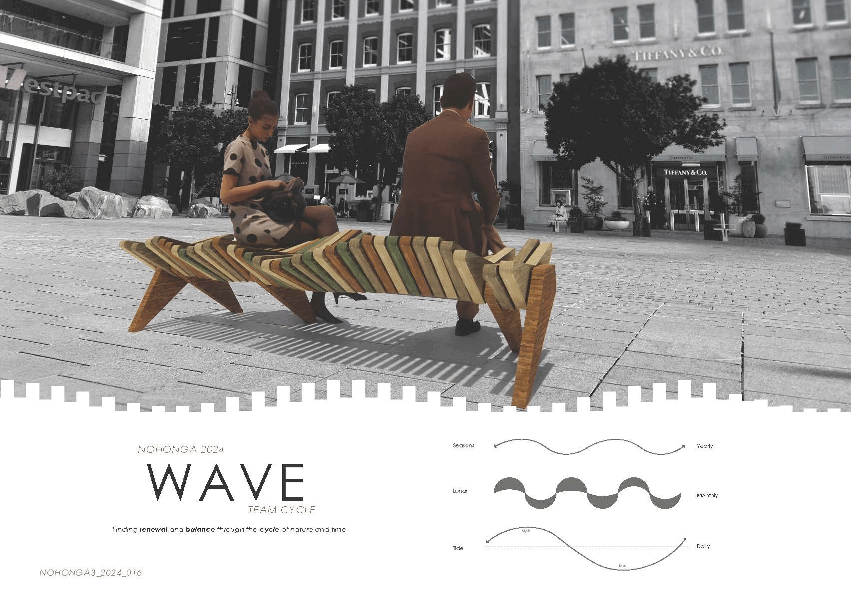 The Nohonga is a representation of the cycles of nature and time. It uses the moon phases (Te Rākaunui) as a starting point. The kinetic element of the bench creates a gentle wave motion when its interacted with and then returns to a resting form. The design needs human interaction in order to start the oscillations of the components.