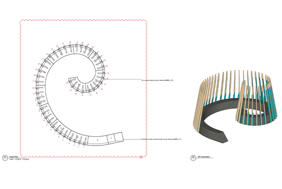 Additionally, the sweeping ramp which continued into the seat has been reduced to one exposed section and is a much steeper grade than the original design. This also enables easier construction, as the team won’t have issues with attaching the vertical elements to the concrete base.
