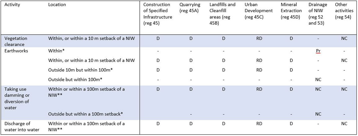 - Earthworks within NIWs that are likely to result in their drainage or partial drainage are a Prohibited activity, unless for specified purposes listed in Regulations 45 to 45D (Table 1).