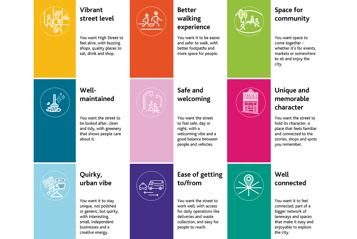 Anne: Phase One and Two of the three-step engagement process involved initial conversations with local High Street businesses and residents; followed by continuing the conversation and expanding outreach to include visitors, shoppers, and other people using High Street. The insights from Phases One and Two generated a series of nine Community Aspirations, and these guided the design brief, which Council used as part of the procurement process to appoint the design lead. The Boffa Miskell design team were successful in being appointed in that role.