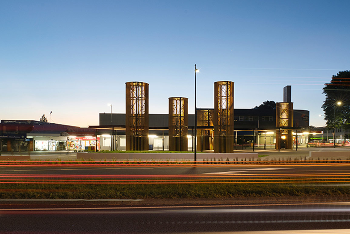 • DCA Architects took the opportunity to incorporate linked sculptural timber towers inspired by, and following in plan, the Southern Cross constellation. Cylindrical timber towers form a striking addition to the townscape and the unifying canopy provides a useful shelter and community space. A carved soffit proposed for the canopy will incorporate local Māori and Pacific artwork. A welcome and well-conceived addition to the townscape.