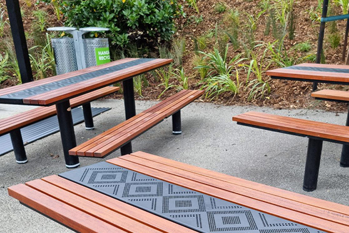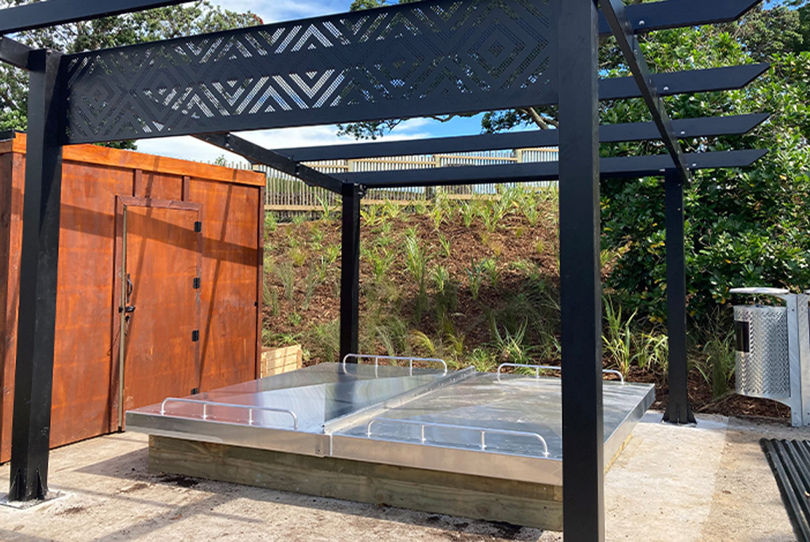 To ensure hāngī can be used safely all year round, a bespoke shelter manufactured by Tilley Group Ltd. provides protection and sheltering whilst incorporating mahi toi to demarcate the hāngī and kai area. To compliment this space, a bespoke suite of furniture was designed and developed, also incorporating mahi toi within the picnic tables, seating, benches and bins.