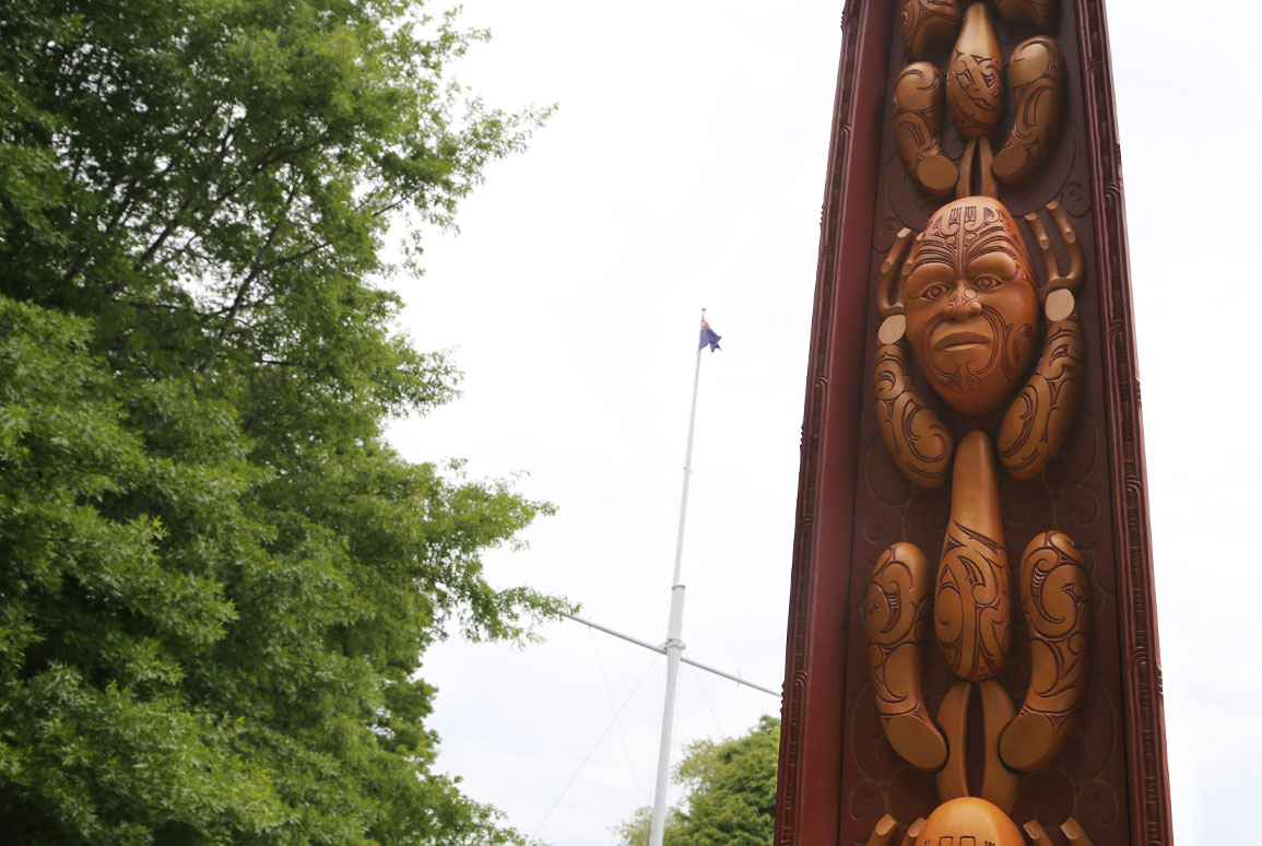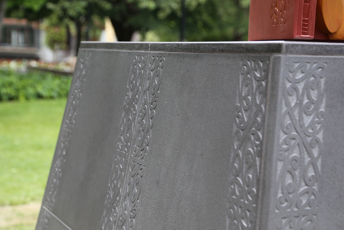 “The carved forms reflect the moko worn by signatories of the Treaty. This artwork portrays the mana of the signatories and supports the Treaty relationship between Ngāi Tūāhuriri/ Ngāi Tahu and the Crown.