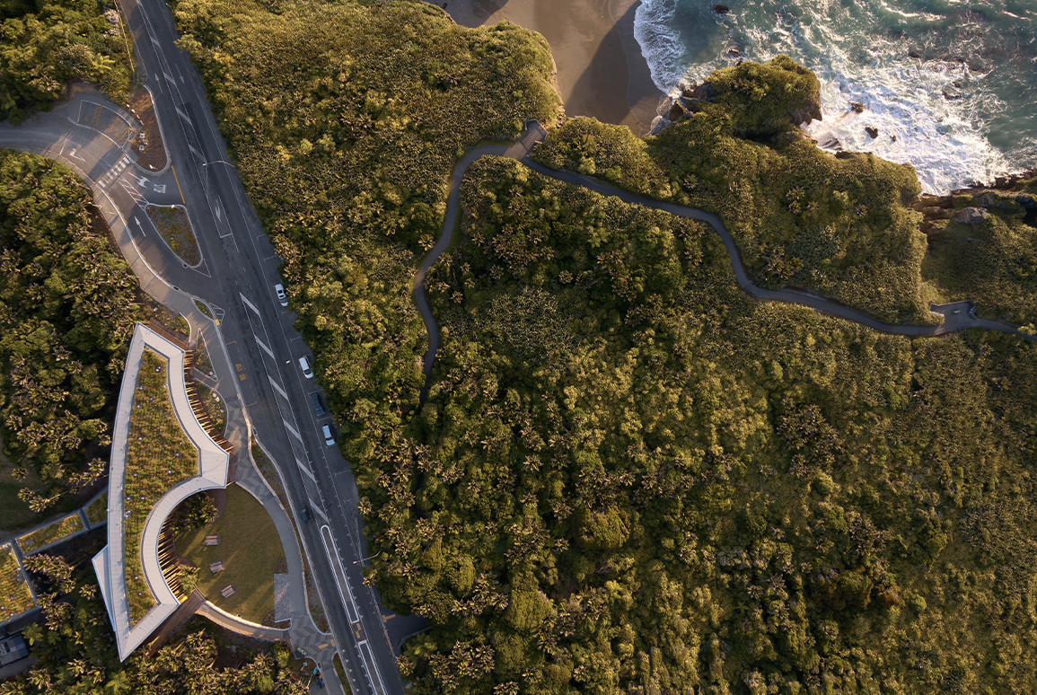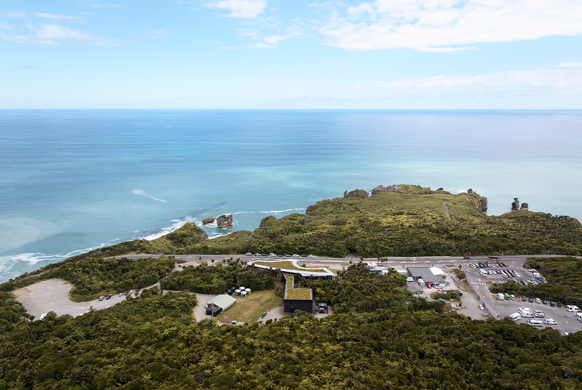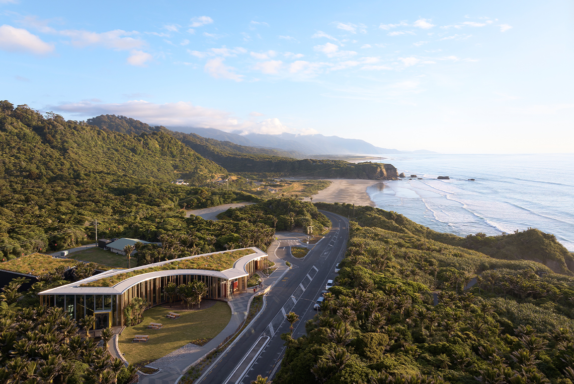 Even in our image-saturated world, the aerial photos of Punakaiki’s new visitor centre Punangairi are undeniably spectacular. Nestled within the subtropical rainforest of Paparoa National Park and topped by a living roof, Sheppard & Rout’s design both blends into and contrasts with the natural surrounds of Dolomite Point and the nearby Pancake Rocks like a spaceship in camouflage.