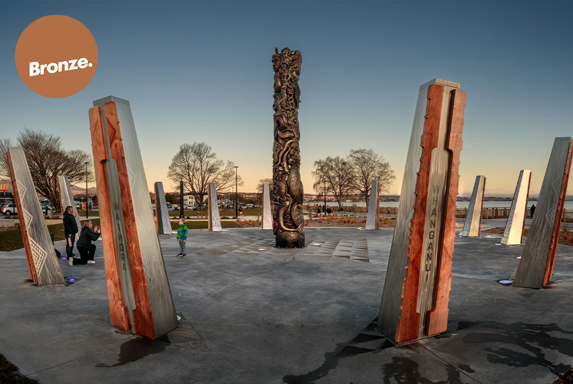 The Boffa Miskell design team and Ngāti Tūwharetoa artists Kingi Pitiroi and Delani Brown took a Bronze Award in the Spatial Design | Private, Public and Institutional Spaces category for Paepae Ātea, Lakefront Taupō.