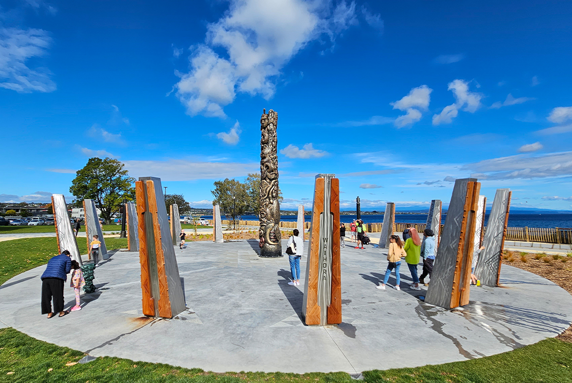 Boffa Miskell designers worked closely with local artist Kingi Pitiroi to create into a gathering place imbued with meaning and connected to the landscape and environment, which also enhances the broader lakefront, encourages pedestrian flow and engagement with public seating opportunities, and identifies and empowers Tūwheretoa people as mana whenua.