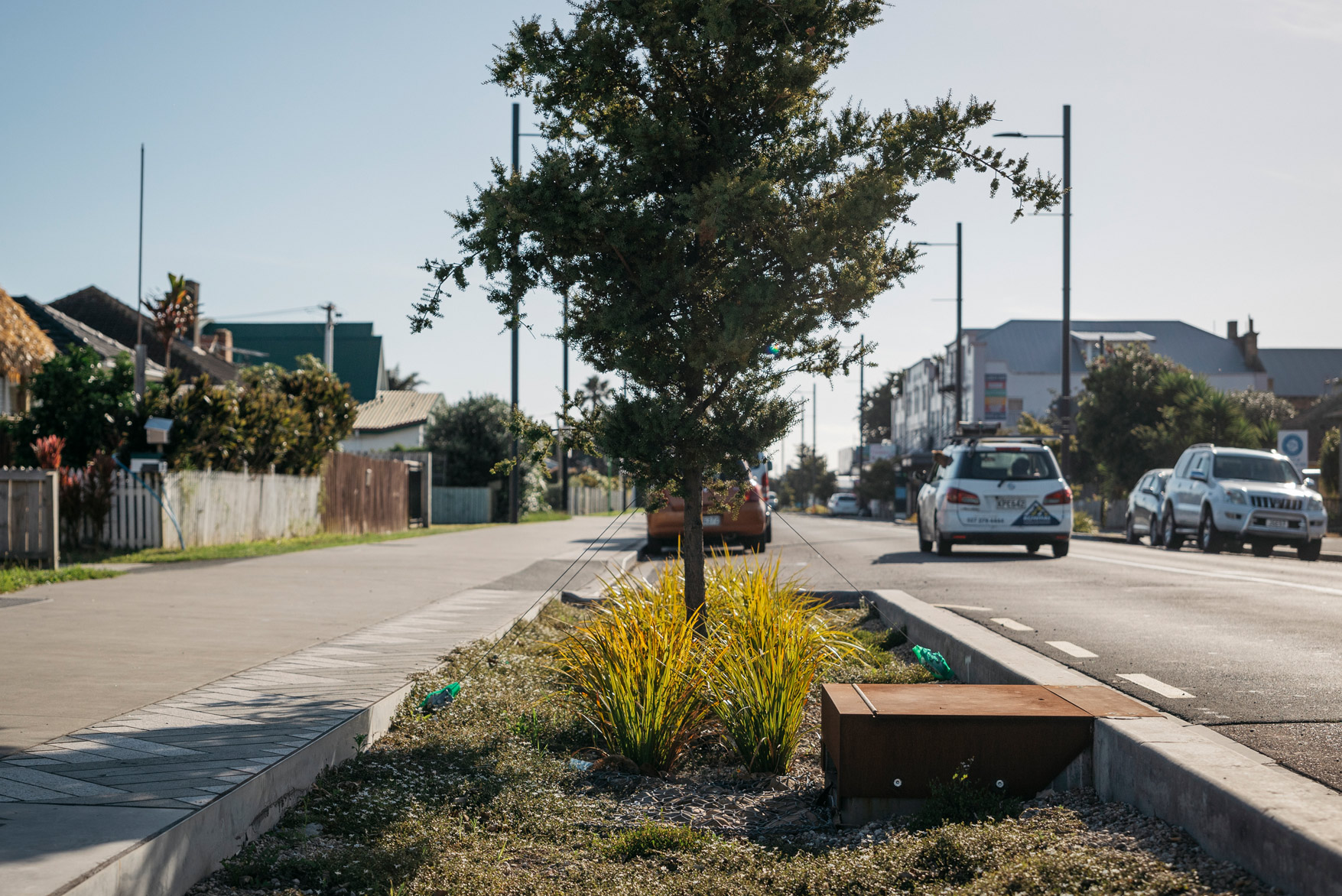 During the design phase, the client challenged the design team to develop an improved rain garden forebay design that would filter the bulk of floating rubbish and sediment out of the incoming water from the road before it entered the rain garden, thus reducing the maintenance requirements.