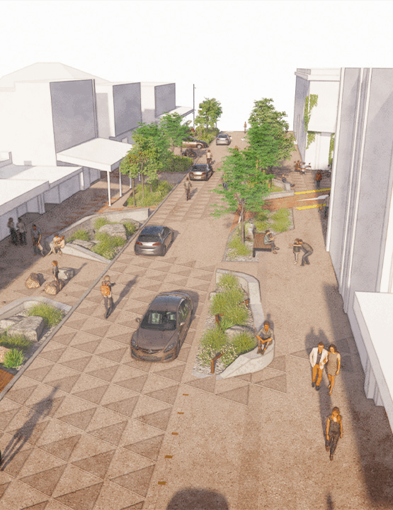 Design development included spatial allocation and vehicle circulation modelling, resulting in a preferred flush street design, enabling public events and festivals to take place. This two-way configuration supports reduced vehicle volumes and integrated cycleways, street greening with over 70 native trees and 30+ raingardens, and pedestrian prioritisation.