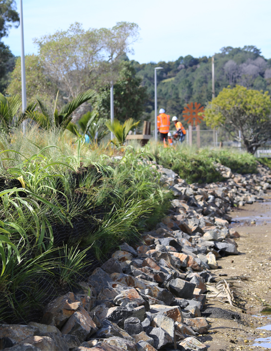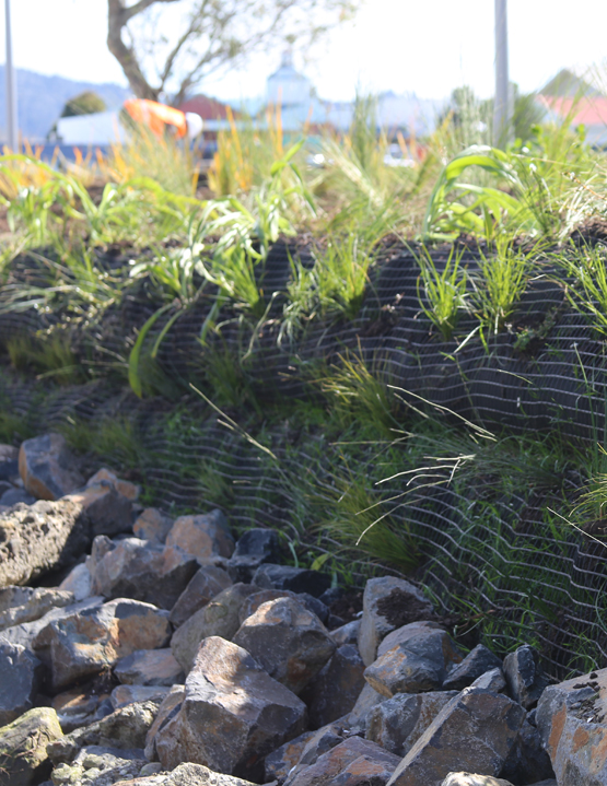Originally designed as a standard stone wall to reinforce the banks of the stream, the upgrade takes a more holistic approach. The revised design includes a living wall which provides visual amenity and ecological habitat, and is a practical ‘green’ solution. Designed by Boffa Miskell with support from Dempsey Wood Civil and support from engineering firm Tiaki, this outcome was the preferred option for both Regional and District Council.
