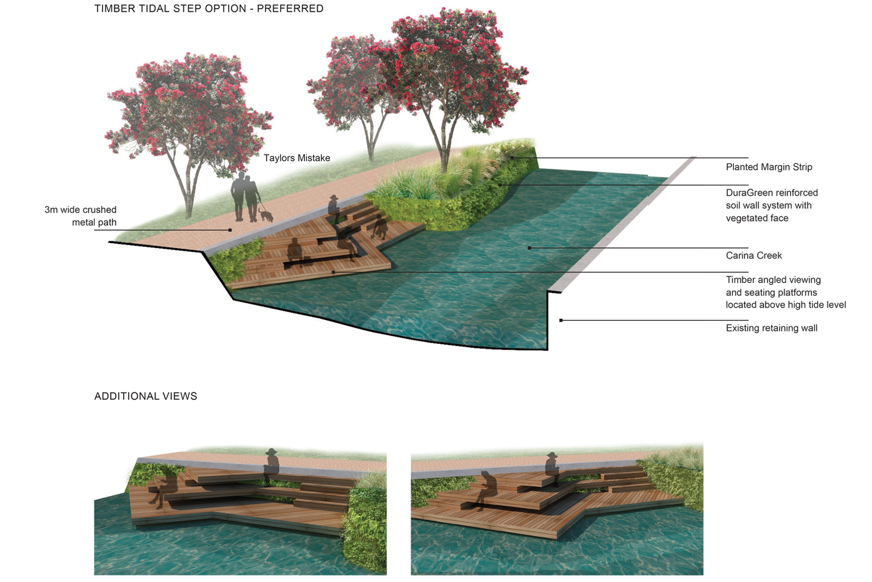 The tidal steps (yet to be constructed) will bring a closer connection to the water, as it changes over the course of the day with tides rolling in and out. This creates a feature of the stream and encourages celebration of the space through a wider variety of uses.