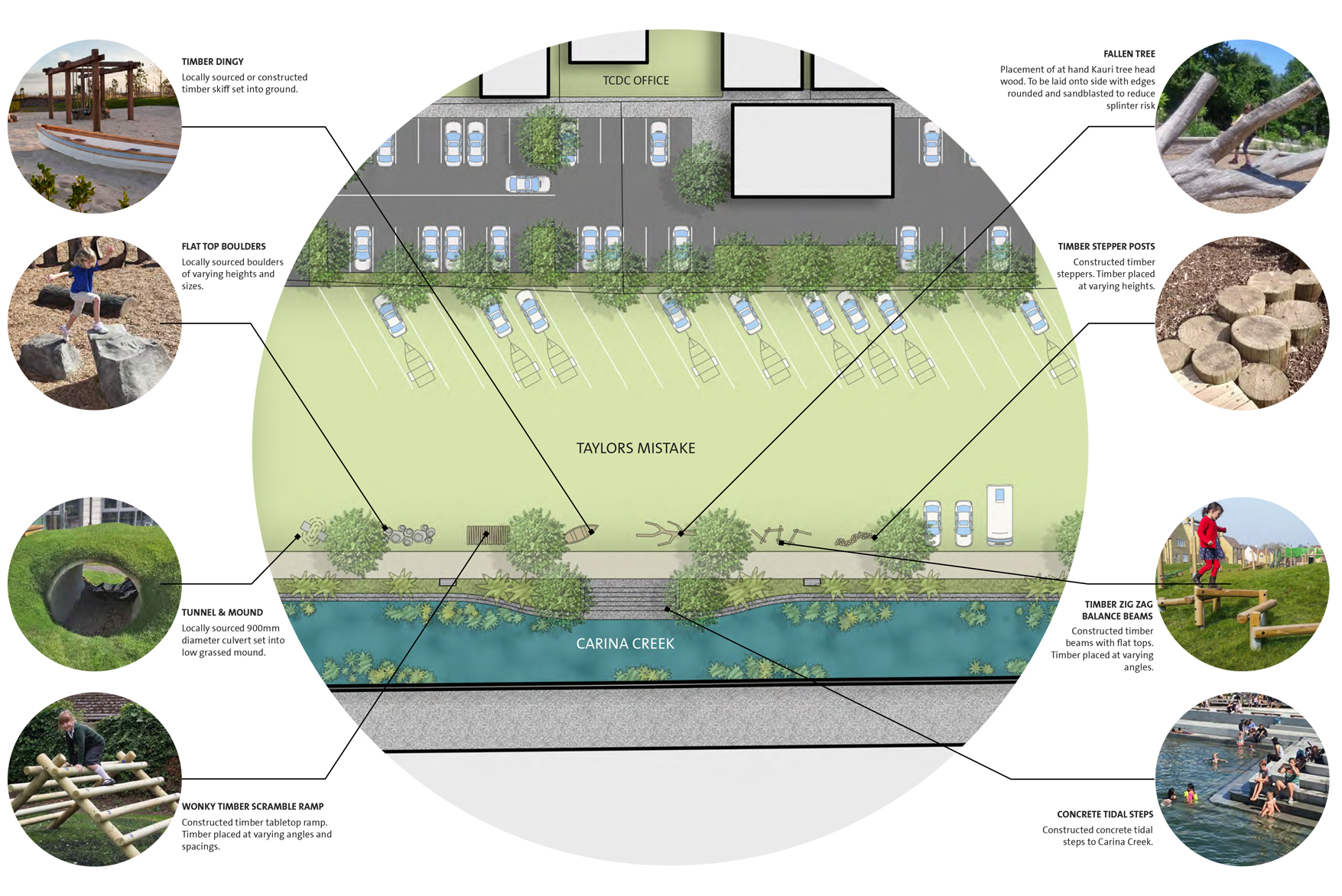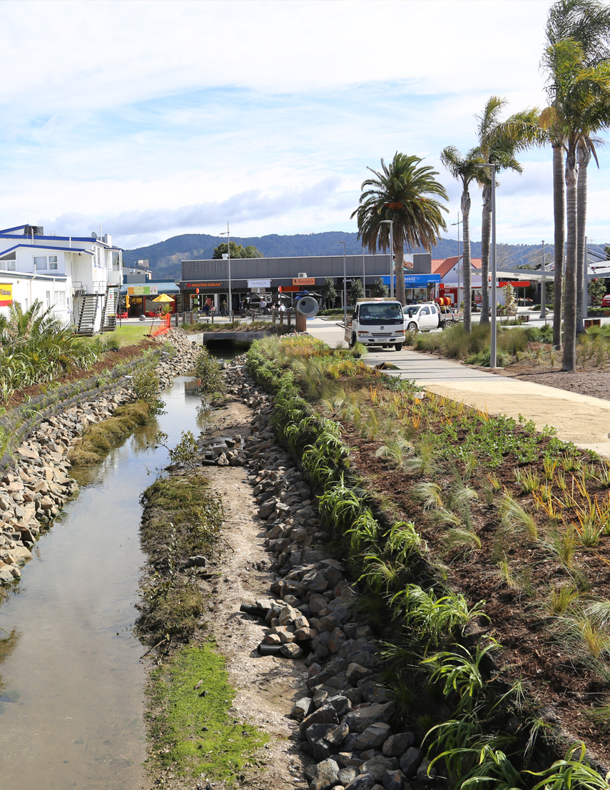 Work along Carina Creek is part of the Whitianga Town Centre Upgrade, and responds to the desire to enhance connections to the harbour and town centre with greater high-quality pedestrian movement paths through Whitianga. Three key elements are the geo-sock living wall, progressive nature play elements along a new footpath, and tidal steps into the stream.