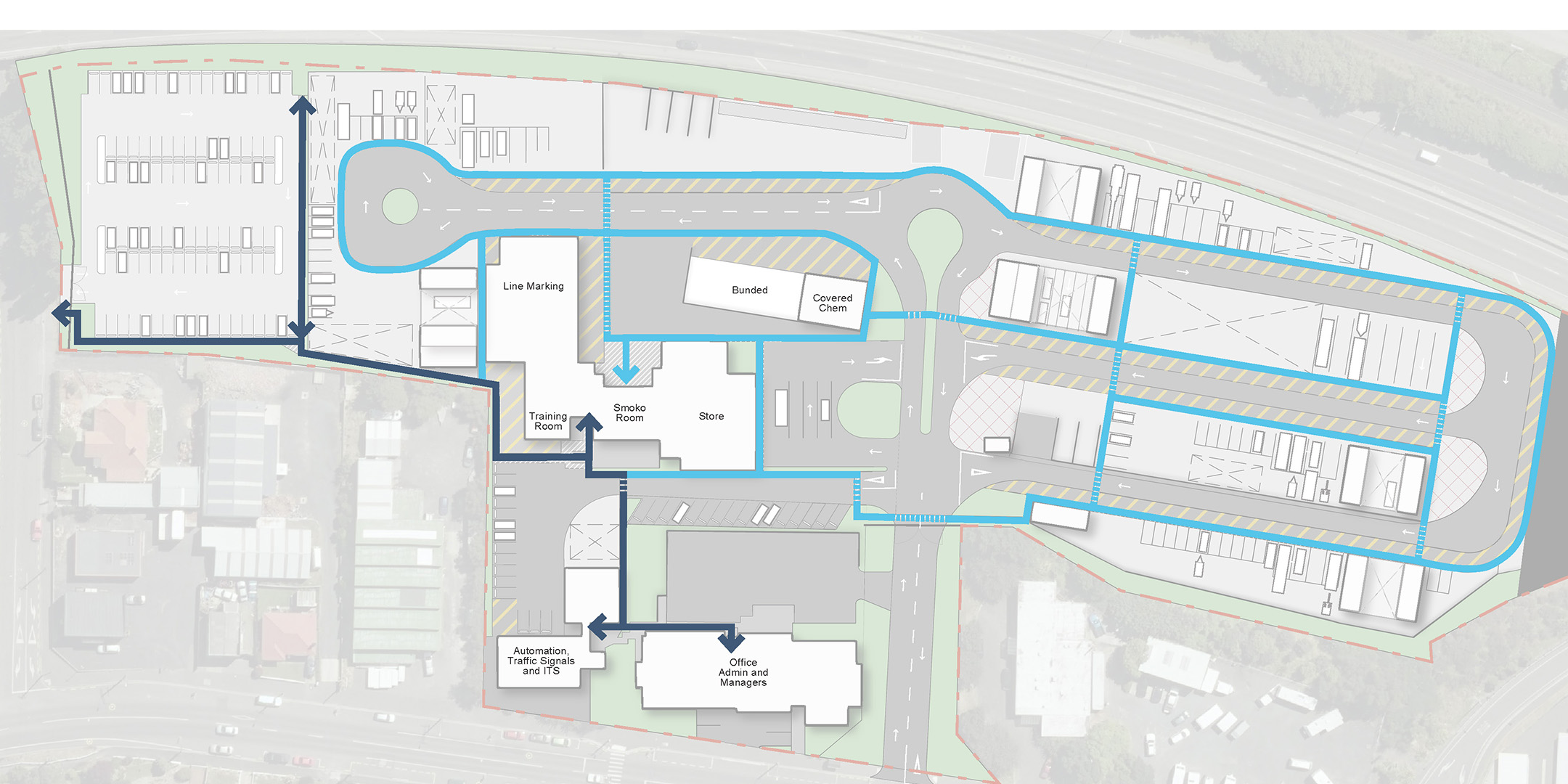 Challenges included creating a layout to accommodate the wide range of vehicles and machinery parked at the depot when not onsite, whilst maintaining good vehicular circulation and pedestrian connections, and ensuring the layout met the 'no reversing' policy where possible. Overall, the proposed layout was underpinned by safety.