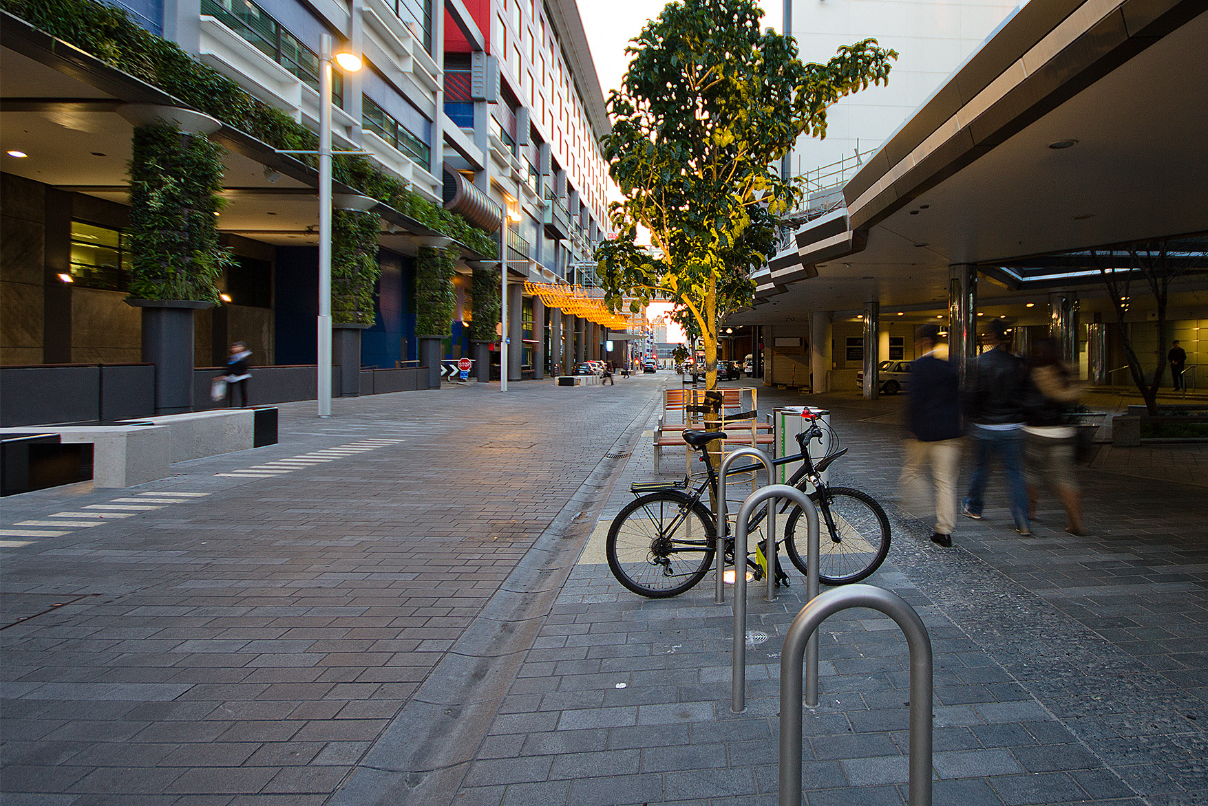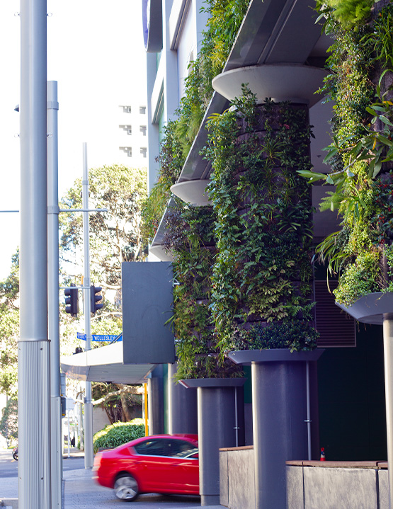 The design was careful to consider the inclusion of trees where possible as an important addition to the amenity and ecology in the city. As much of the Sky Tower Plaza is over a podium roof structure, the designers wanted to avoid the need for raised planters, placement of trees required careful coordination with underground structures as well as servicing and event requirements. A green wall treatment has been installed to the structural columns and structural beam of the west side building façade to increase planting in Federal Street.