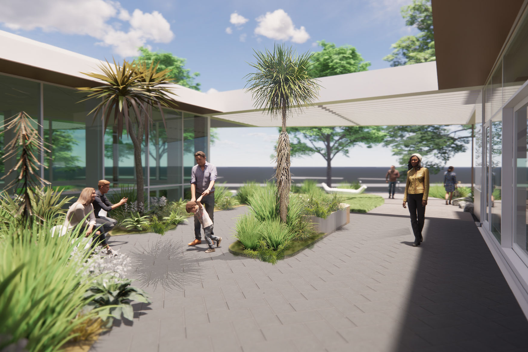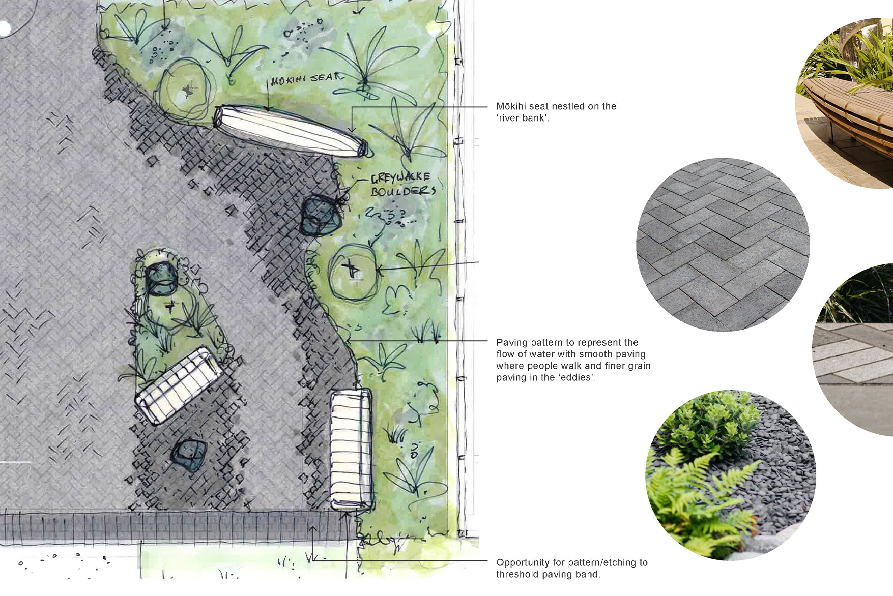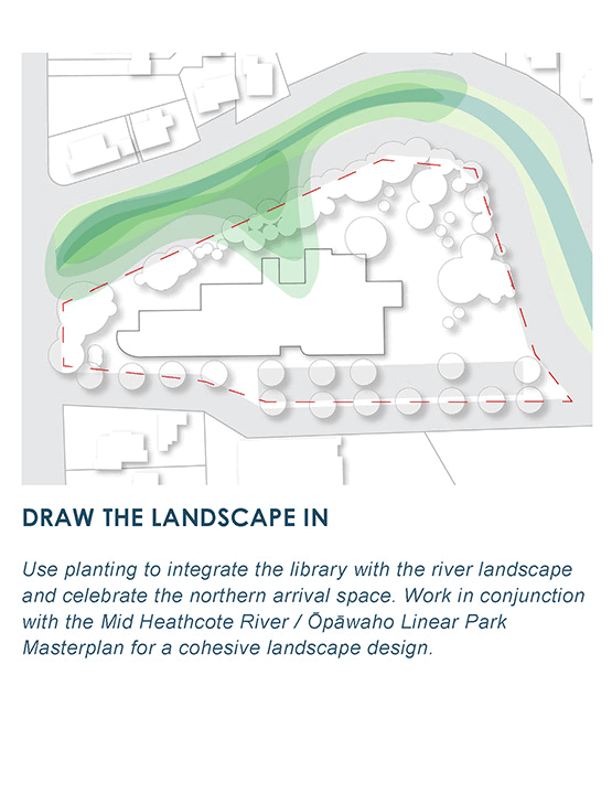 The landscape concept aims to sensitively integrate the building with the context, making a strong visual and physical connection the Ōpāwaho River.