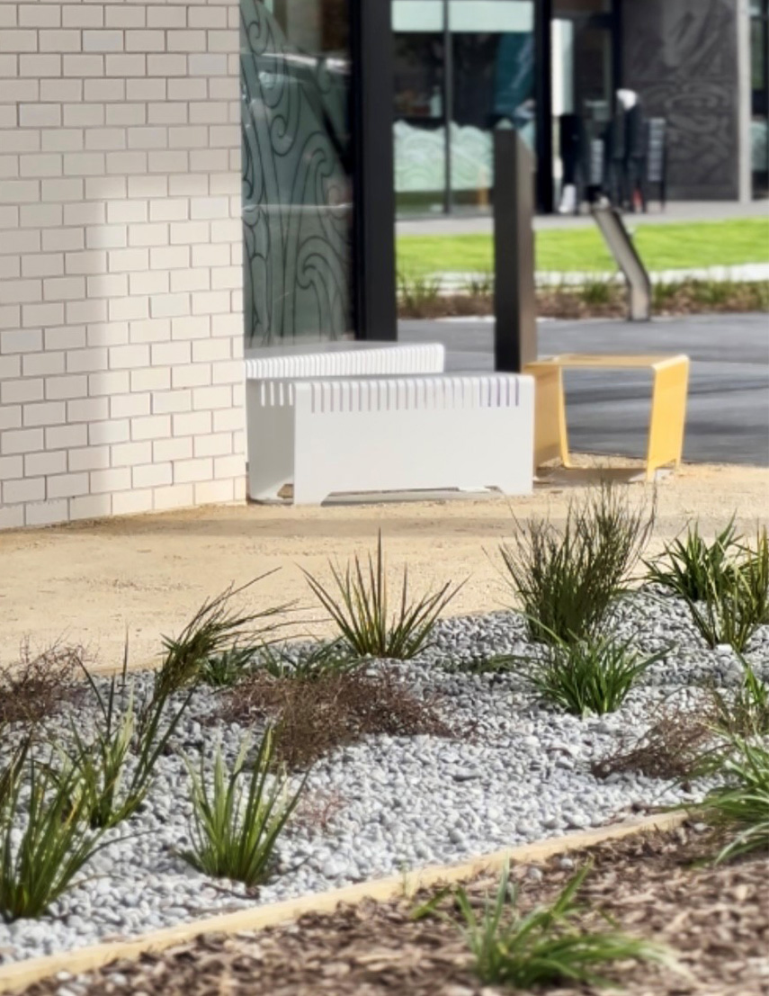 The design creates a welcoming community courtyard and events lawn on the sheltered north facing side of the building. Massed native planting areas provide a cost-effective and low maintenance landscape that will significantly improve the biodiversity and amenity values in Kyle Park. The car park and stormwater treatment areas are located on the east and southern sides of the building.