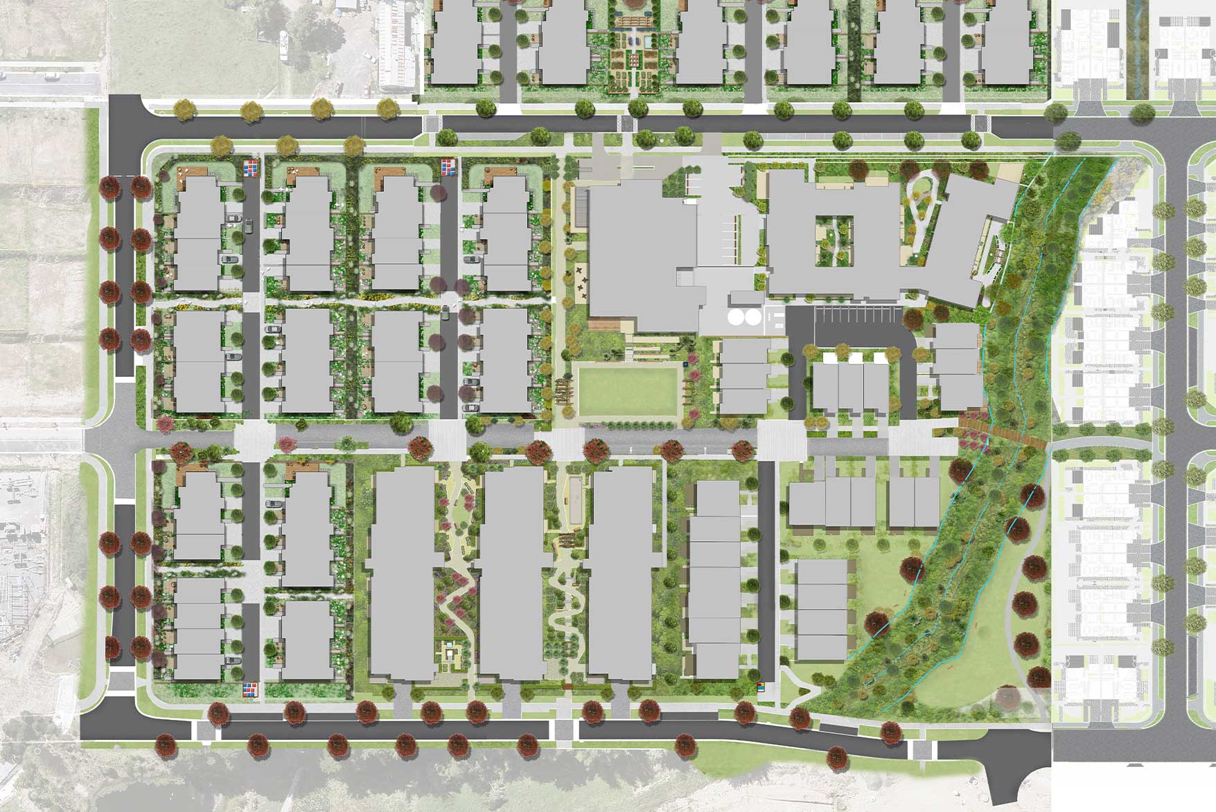 The landscape design presents a warm, sandy and beachy look that responds to its setting. Each major open space is interconnected through informal green corridors with many plant species of varying colours, textures and seasonal interests.
