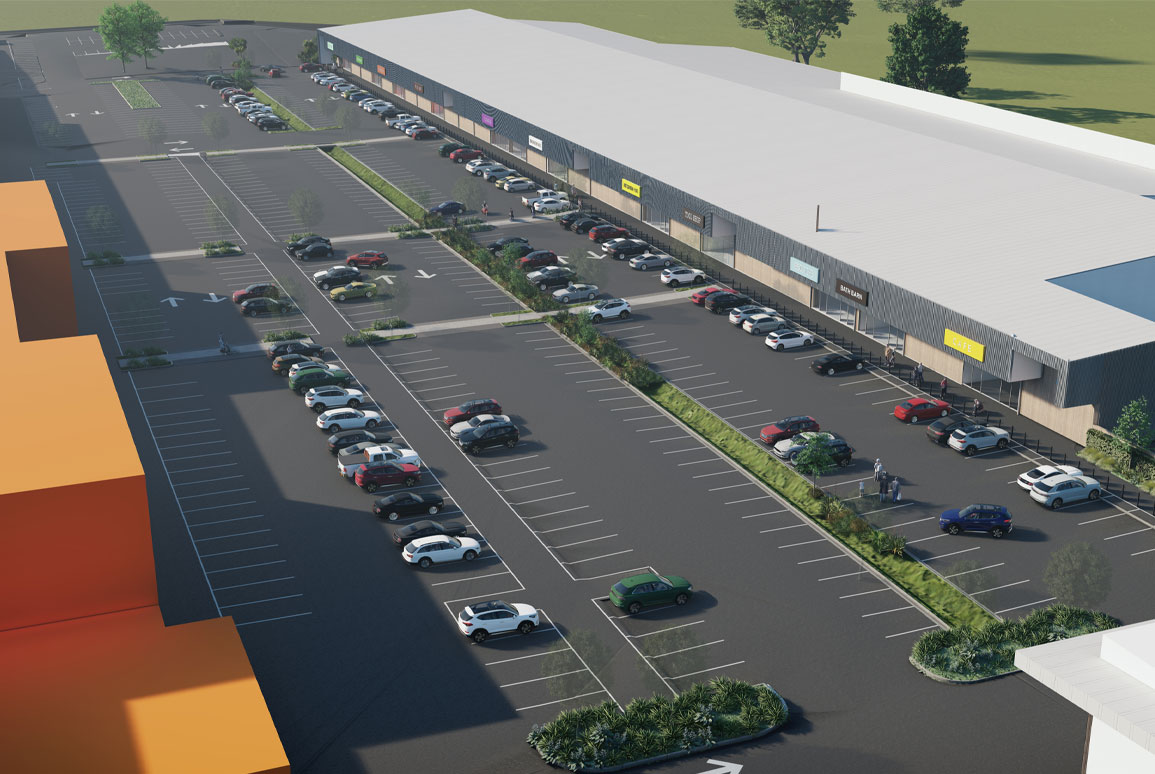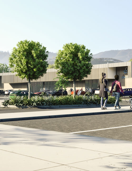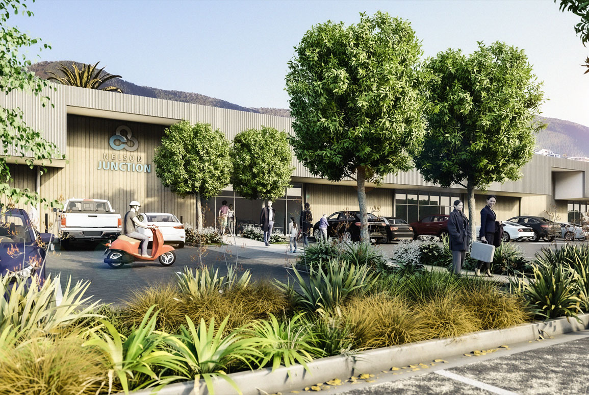 The client wanted to settle the new commercial development at Nelson Junction into the site with strong pedestrian connections across the carpark linking the existing Mitre 10 area to the new area. Challenges included meeting the client's needs of planting the detention pond and carpark space while also keeping planting low, as to not interfere with views of neighbouring commercial areas.