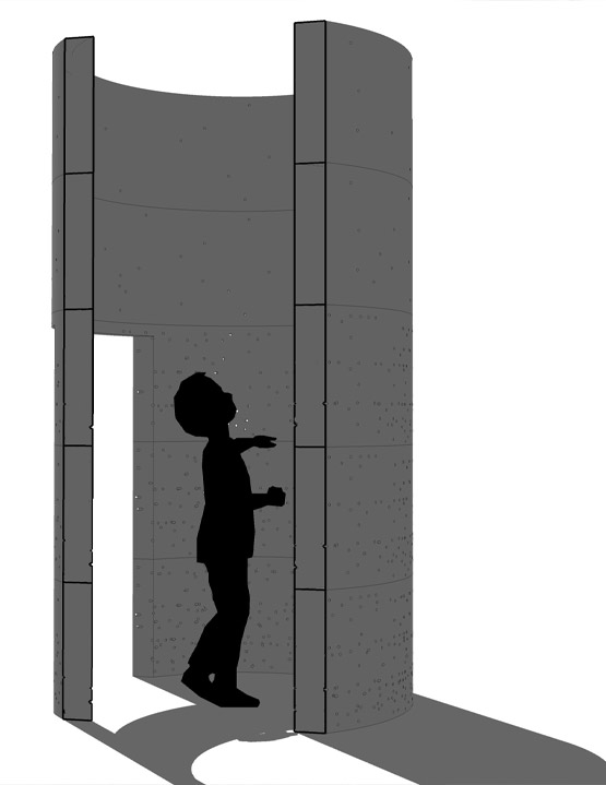 Remembrance through visual art takes the form of a concrete memory column. The scale of the door requires visitors to bend low to enter, echoing the physical confinement of the battlefield trenches. The size of the opening and internal diameter has been designed to allow a wheelchair to enter and turn around. The column is pierced by 2,700 pinholes, in a random array, representing the number of the fallen – dead, wounded and missing – at the end of the first day. Underfoot, 846 bronze inlays symbolize the New Zealand soldiers killed within the first hours of the battle.