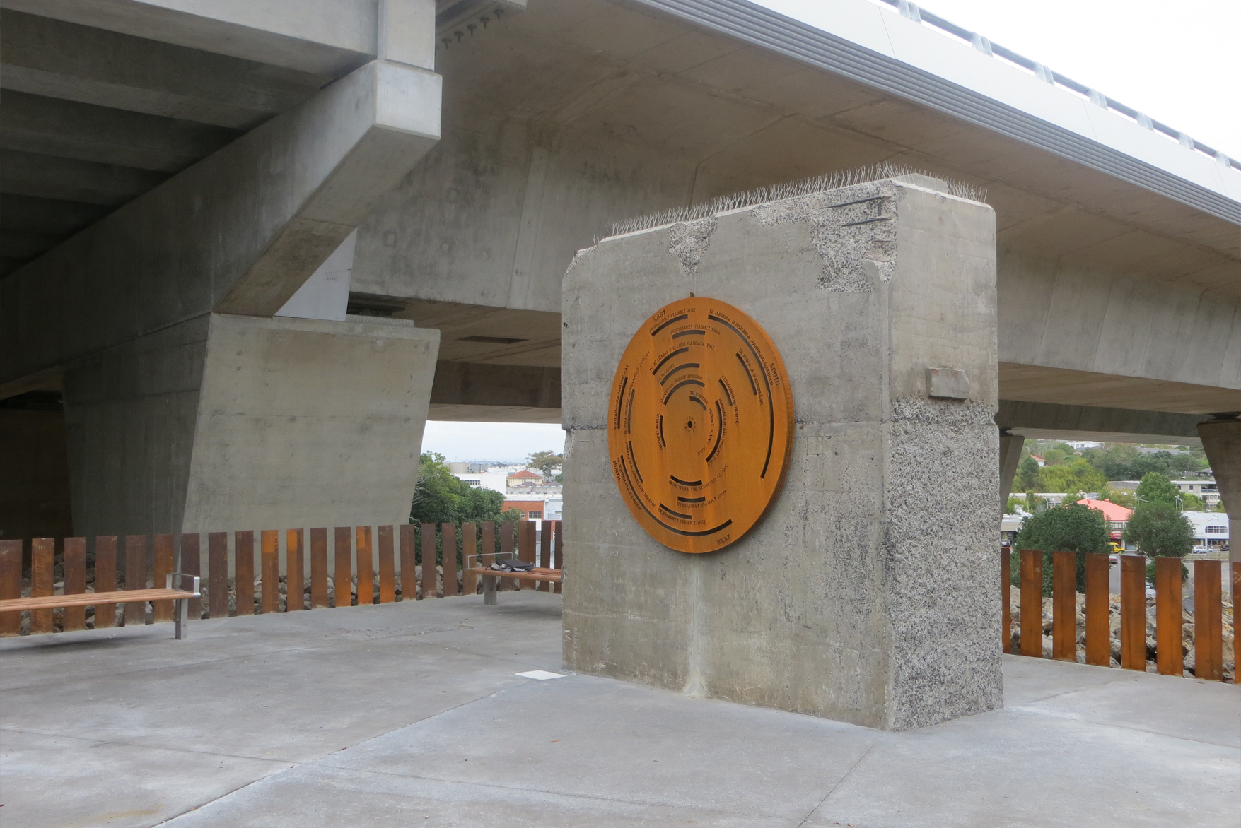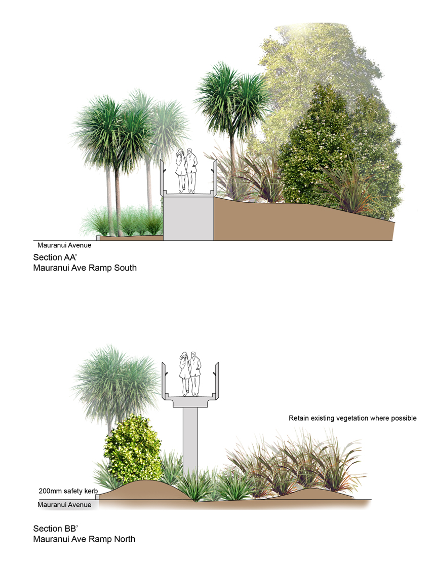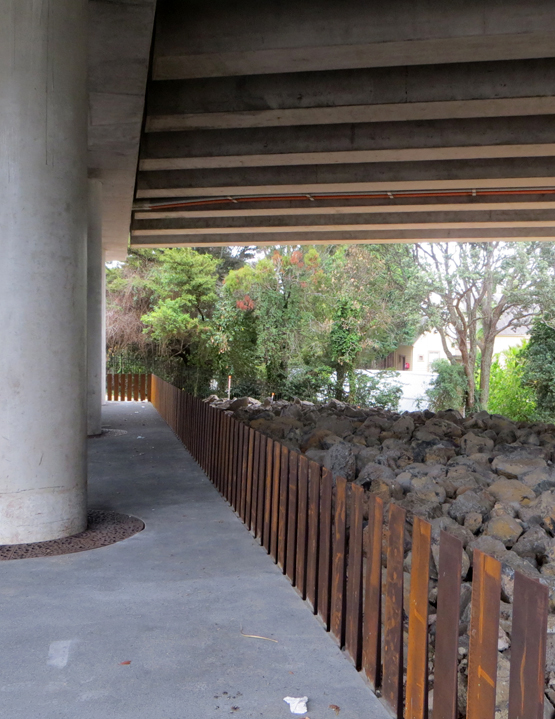 - Gillies Avenue Off-Ramp: The remu-wera patterned retaining wall references the surrounding area and the basalt aggregate builds on the volcanic theme. An additional timber wall was installed along the northern boundary and additional strip of planting along the off-ramp edge.