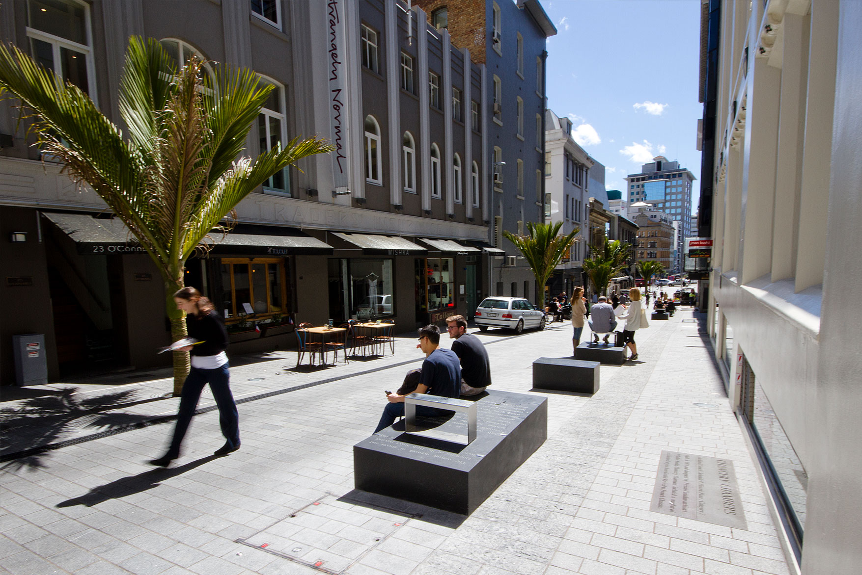The upgrade of O’Connell Street presented a number opportunities to transform the streetscape while preserving the heritage architecture. Boffa Miskell landscape architects worked with Auckland Council Heritage officers, New Zealand Historic Places Trust and the project archaeologist to highlight particular features of the social and urban history and enhance views of the unique architecture and façades.
