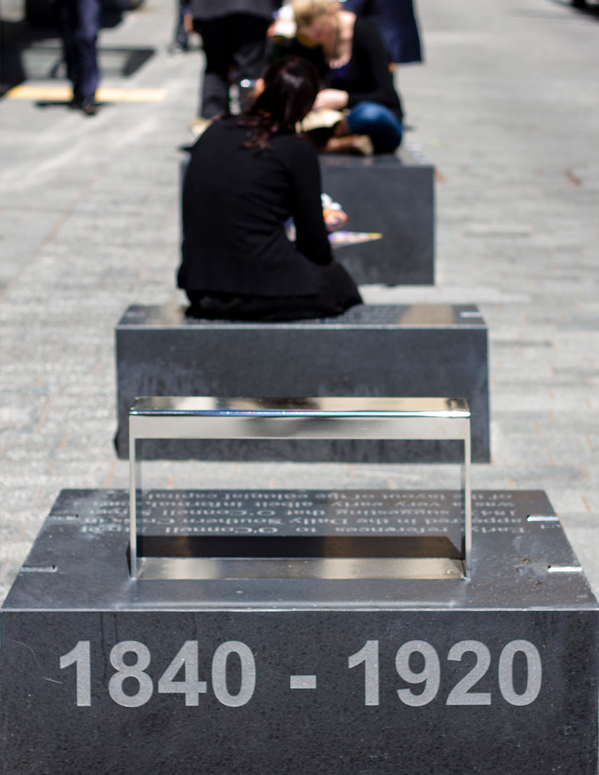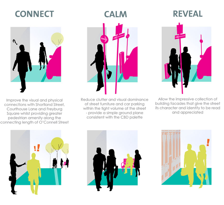 The upgrade of O’Connell Street presented a number opportunities to transform the streetscape while preserving the heritage architecture. Boffa Miskell landscape architects worked with Auckland Council Heritage officers, New Zealand Historic Places Trust and the project archaeologist to highlight particular features of the social and urban history and enhance views of the unique architecture and façades.