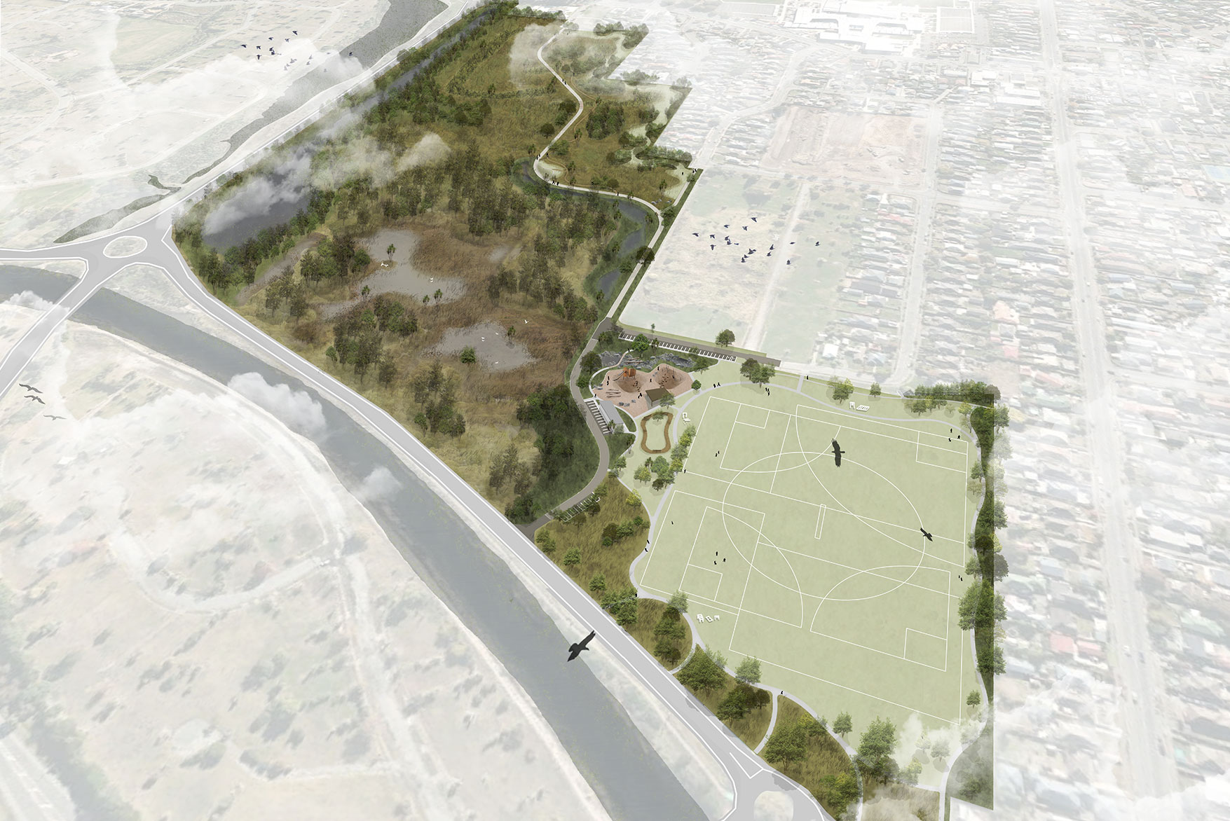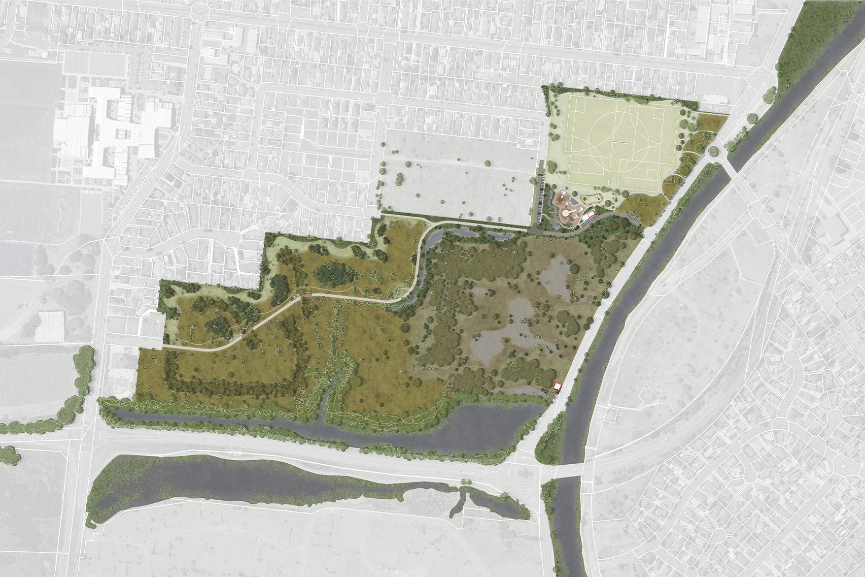 A landscape-led design for ecological regeneration, community connection, and resilient open space.
