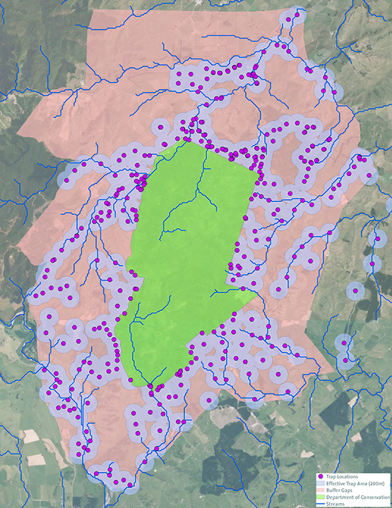 The buffer zone is a critical component of the restoration work at Pukaha Mount Bruce, and a vital part of its success. The objective of the buffer zone is to prevent (or at least greatly reduce), reinvasion of pest species into the reserve. The importance of an efficient and optimised buffer zone has been highlighted by the continued incursions of ferrets into the reserve, resulting in deaths of kiwi.