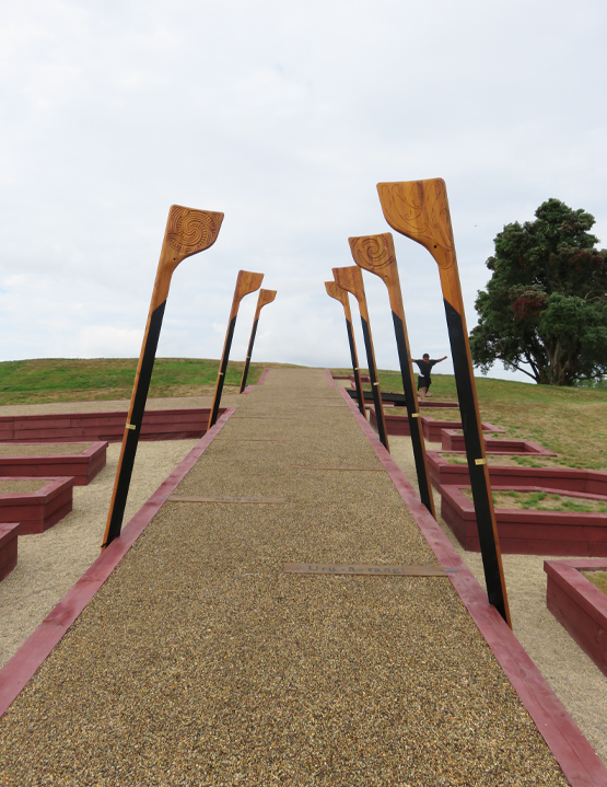 The memorial reinterprets the footprint of the original pā trenches and lines those trenches with retaining walls using timbers carved by a Maori artisan to reflect part of the symbolism of the pā and the Kiingitanga movement.