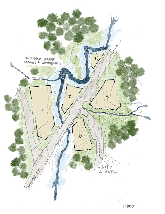 The design team prepared multiple masterplans for subdivisions of the wider site. These layouts integrate new building platforms with the existing landform, utilise former forestry access roads where possible, maintain ecological buffers and riparian corridors, and provide for a future network of accessways, roads, and restoration and amenity planting.