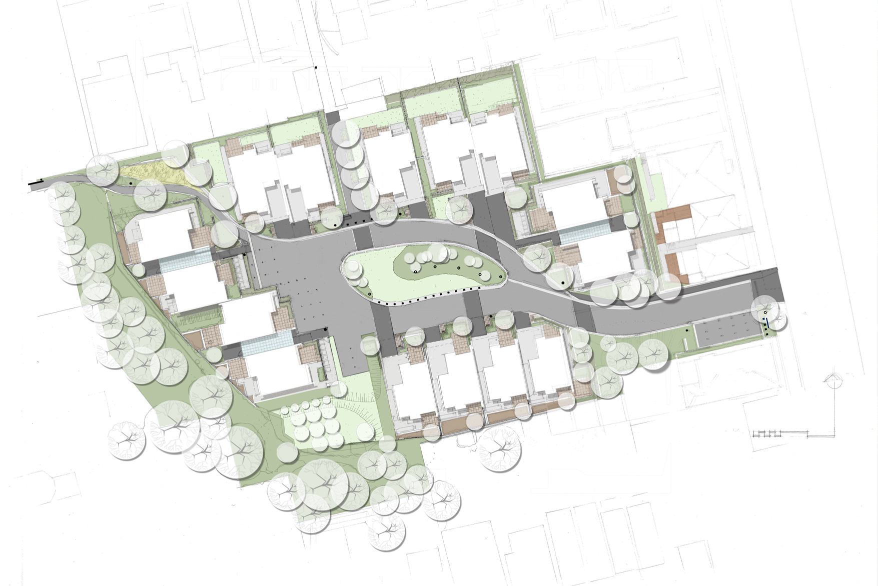 The landscape design reinforces the feeling of community that is created by the arrangement of housing units around the central open space, with its bioswale. This attractive and sustainable design element treats stormwater and gives unique identity that references to the hydrology of the site. Defined and well-lit walkways with identifiable private front and rear courtyards that clearly demarcate private and public space are expressed in the landscape to give a safe environment to those who live and visit the site.