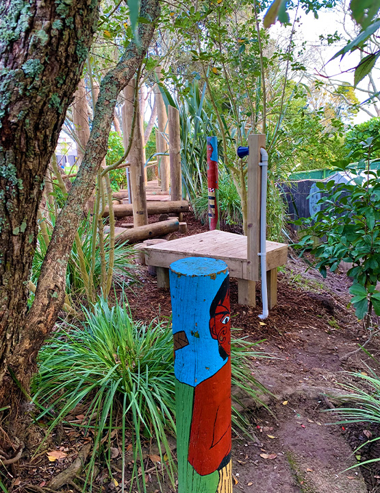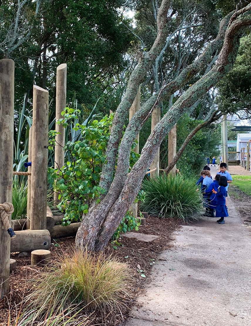Unitary plan regulations, existing infrastructure and roots from the large trees on site were challenging constraints for the nature playspace. Our design proposal was a log scramble balance beam structure with integrated deck, log steppers, rope handhold and adjacent small platform decks with ‘Talk Tubes’ that would enable conversations between all three structures. A large reading deck was also constructed around a nearby Pohutukawa tree.