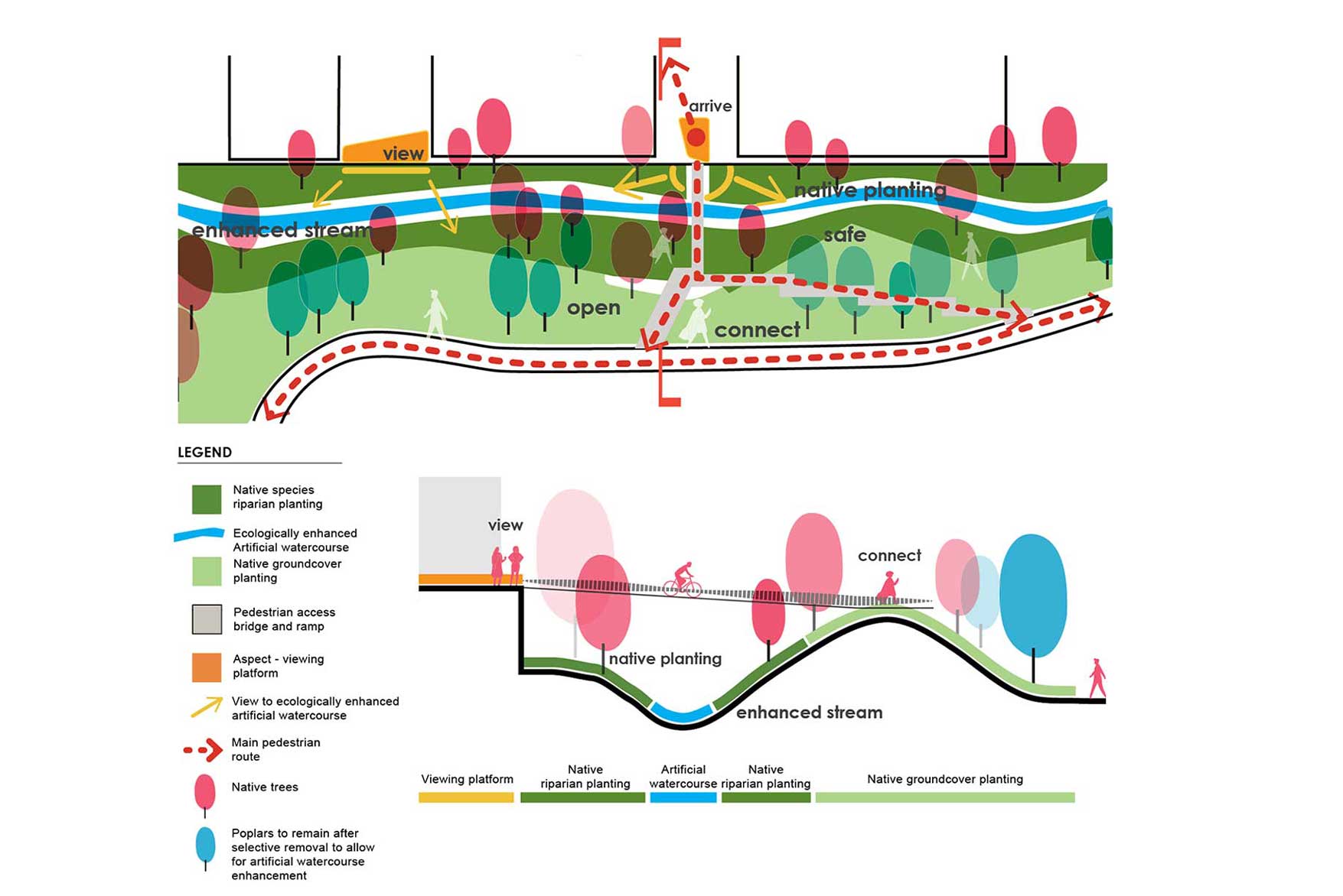 The heart of the outdoor space, the north-facing communal open plaza will encourage to come outside to relax and socialise. It will be a hybrid of hard and soft spaces with feature lawns, paved areas and decks. The lawn areas will be raised to incorporate seating edges, and there will be a series of pocket spaces for smaller gatherings and relaxation. Other landscape features include informal community gardens and restored riparian planting along the existing watercourse. The proposed boardwalk access to the south of the site will maximise the connectivity to the Sylvia Park development.