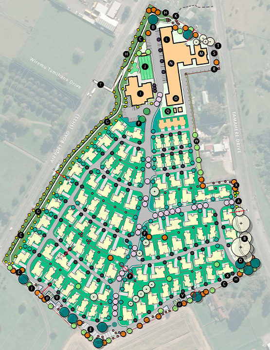 Prior to development, the site comprised existing industrial activity and adjoined a community destination (St Stephen's Church) and several residential sections. Redeveloping the site as a retirement village has enabled more appropriate land use adjacent to the Church and wider Tamahere. The key features have been designed to maintain and enhance the rural character and amenity.